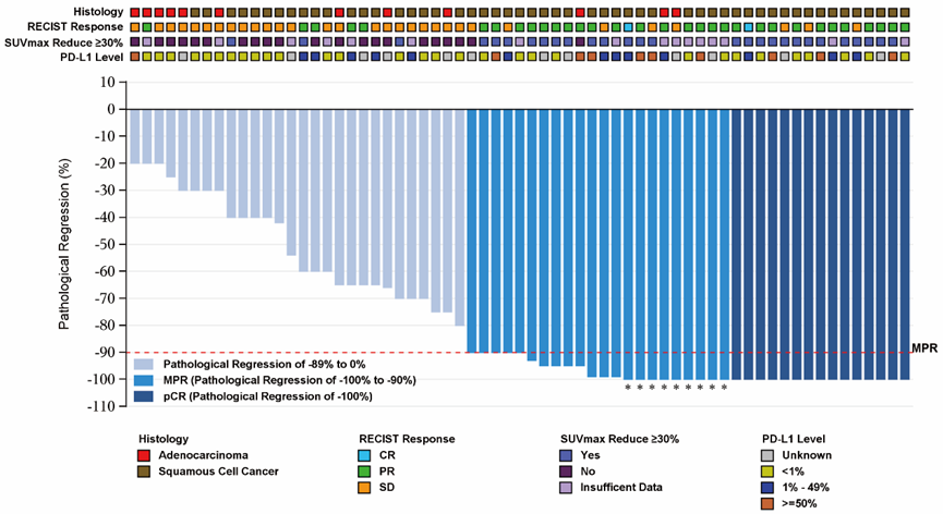 该研究达到主要终点,57%的手术患者达到MPR,pCR率为23%;
