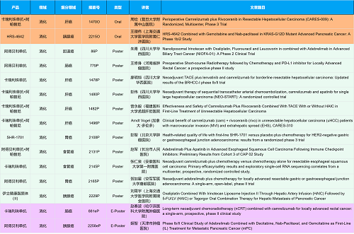 在消化系统肿瘤领域,PG创新产品相关研究共入选2项口头报告、10项壁报和2项电子壁报,共14项研究。除了明星药物卡瑞利珠单抗和阿帕替尼外,还有5篇阿得贝利单抗治疗消化系统肿瘤的研究入选。此外,HRS-4642、瑞拉芙普-α注射液(SHR-1701)等未上市创新产品也有相应研究入选。随着新老药物前沿研究的不断推进,有望为消化系统肿瘤患者带来新的福音!